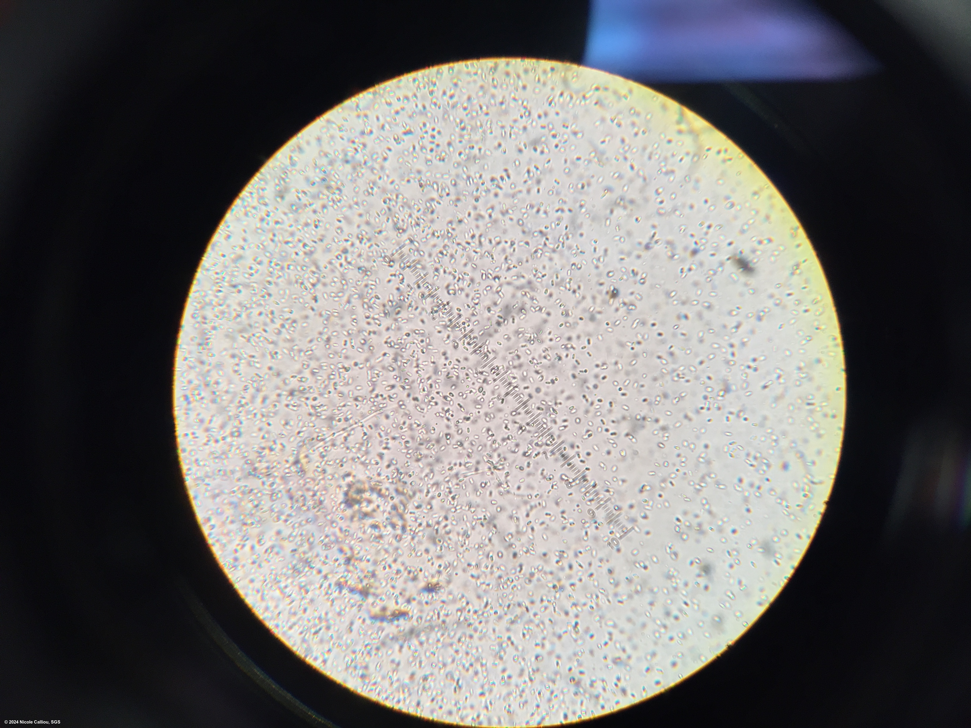 Loose growing silver white mycelium and pycnidia primordia of Leptosphaeria on seed and substrate. Pycnidia are relatively large, about 250 um, with papilla, sometimes developed as a neck and often has purple (amethyst) exudate.