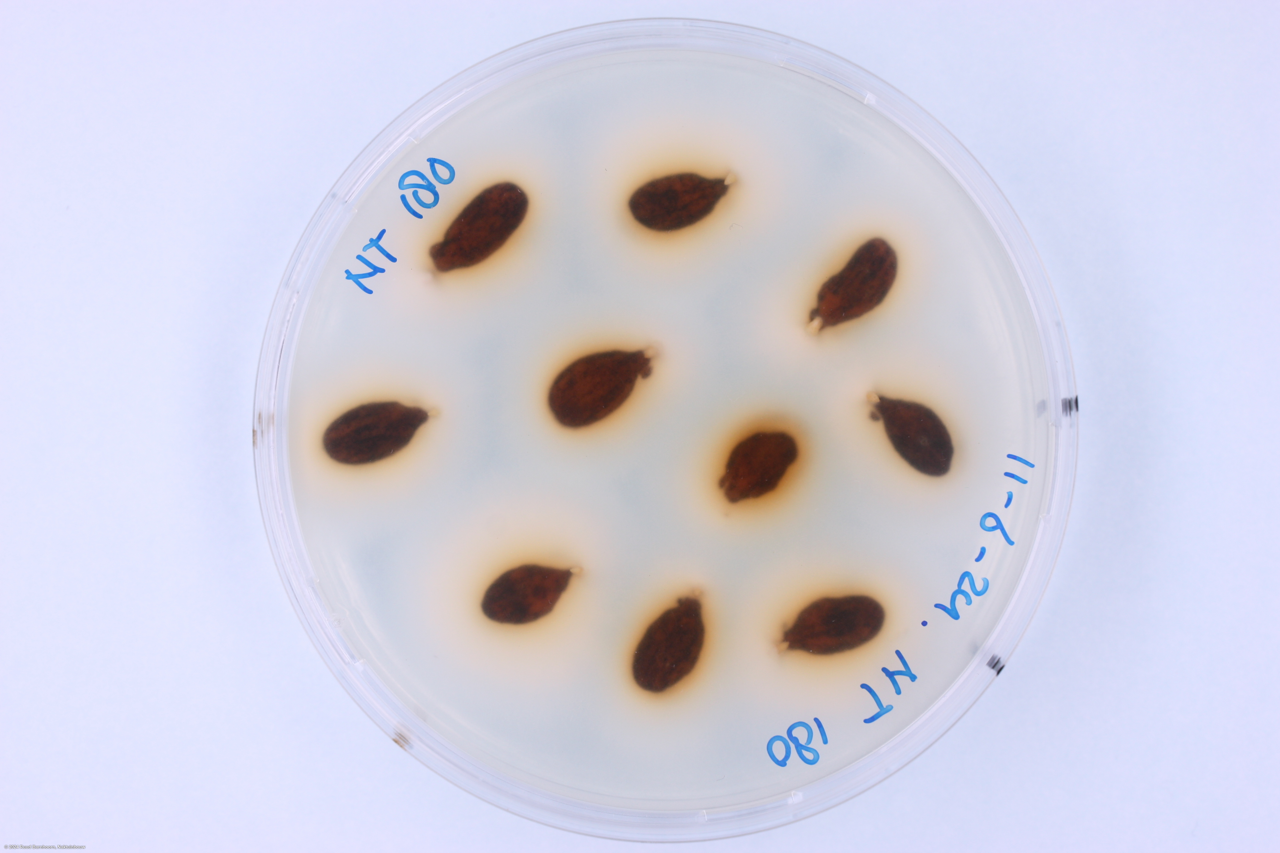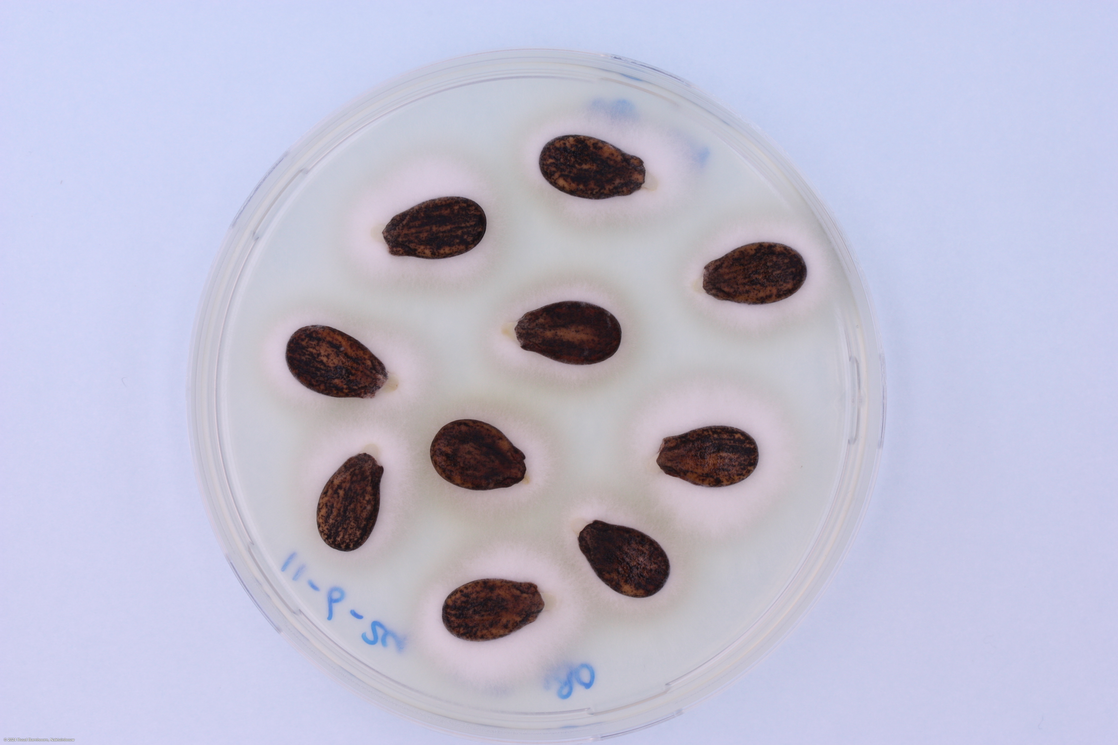 In the pictures you see two different races of F. oxy f.sp. niveum. Fon Race1 is white fluffy and Race 2 is orange, less fluffy on artificially innoculated watermelon seed. If the colors are really race specific I can't tell, but at least a difference in color appearance is possible between Fon isolates