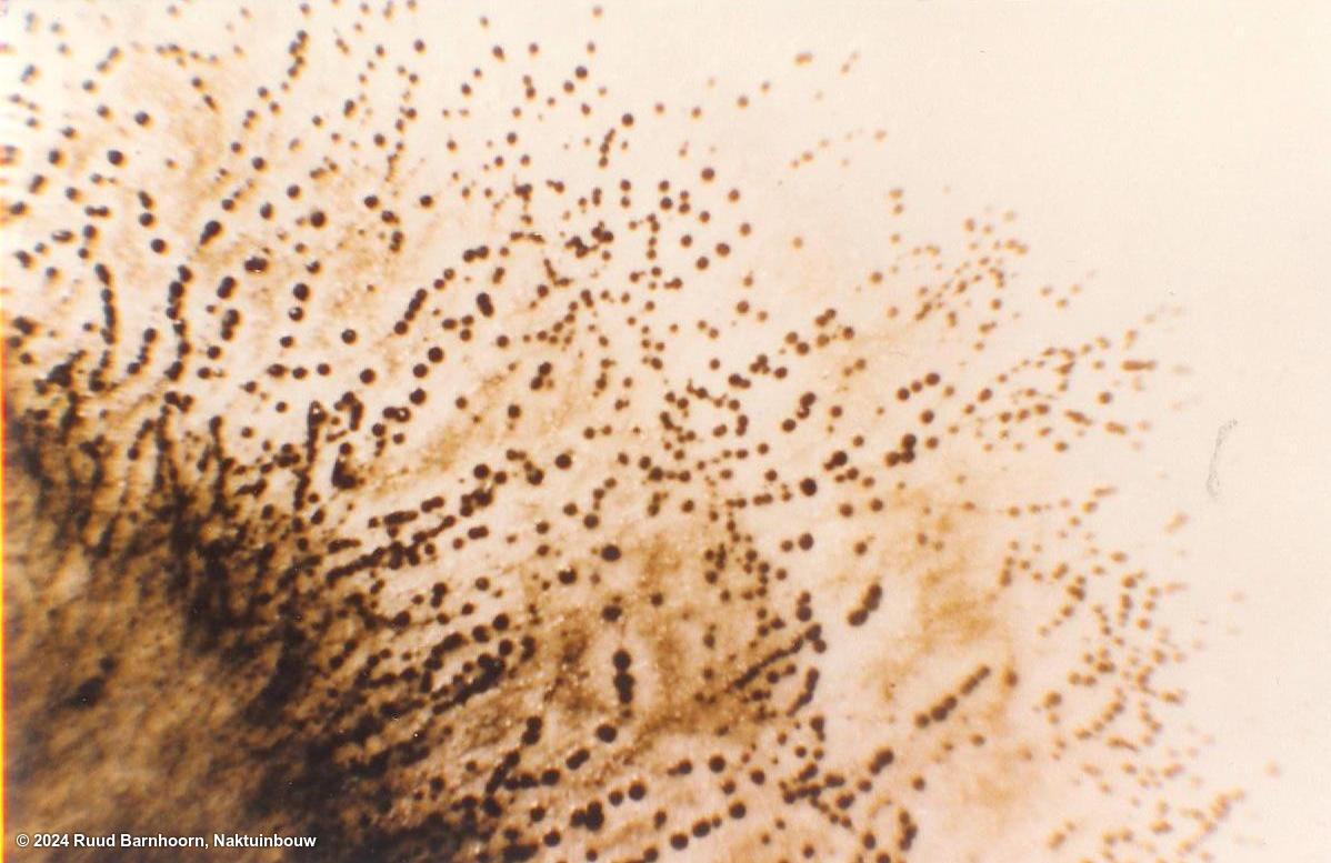 What you see are pea seed under the binocular with lighting below 2.5X zoomed. A clear brown colony with an umbrella of brown spore structures can be observed.