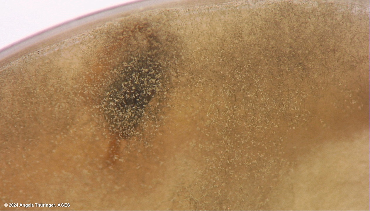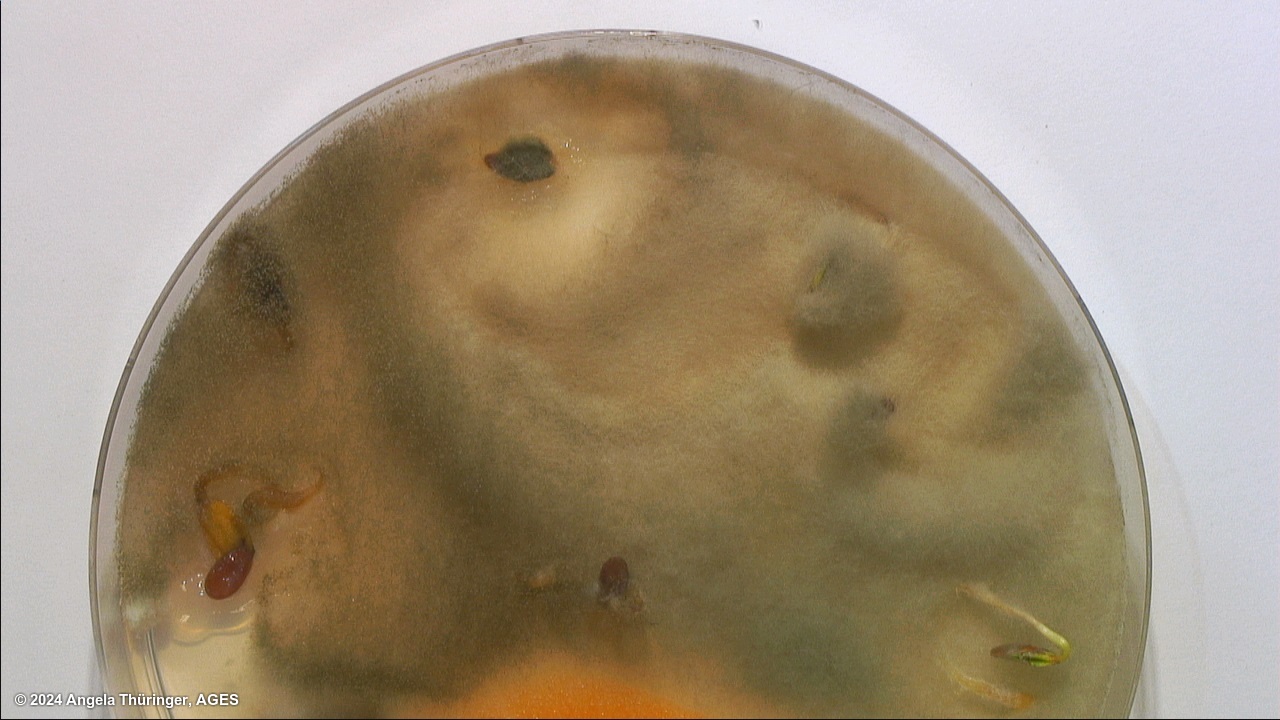 The first image shows a Botrytis cinerea colony (big grey and airy colony) on Flax, accompanied by Colletotrichum linum (orange) and Alternaria linicola (small grey colony). The other two images only show Botrytis cinerea on Flax.