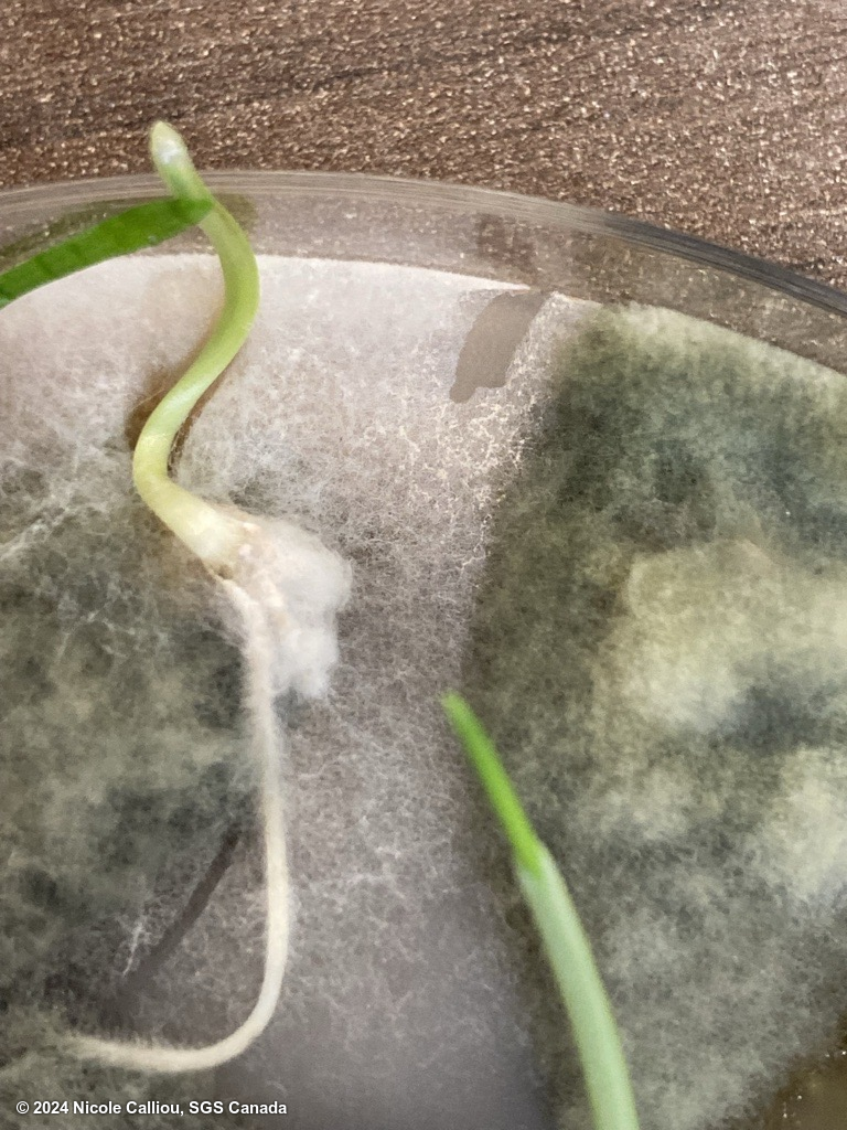 Colony is potentially Microdochium nivale or Microdochium majus, DNA testing not done to differentiate. Light pink coloration of colony when grown in fluorescent + NUV light. Colony shows orange sporodochia. Colony grew despite incubation at above-optimum temperature for Microdochium spp.