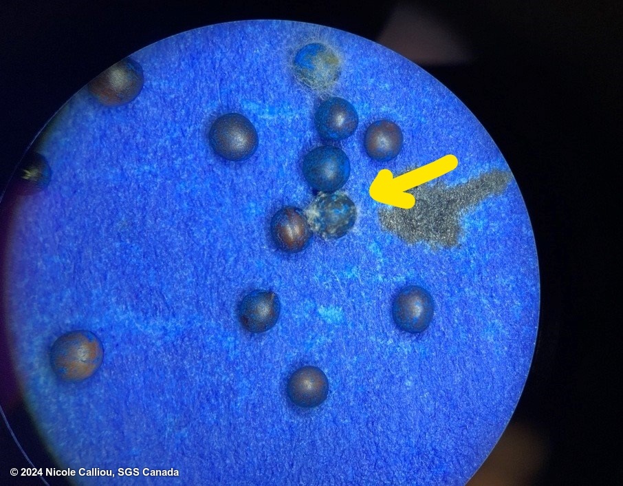 Although seed treatments should inhibit most fungal growth, this can be untrue when applied incorrectly. The indicated seed (yellow arrow) shows typical blackleg infection symptoms (silvery loose hyphae and pink ooze from black pycnidia), and was confirmed by PCR to be P. big.