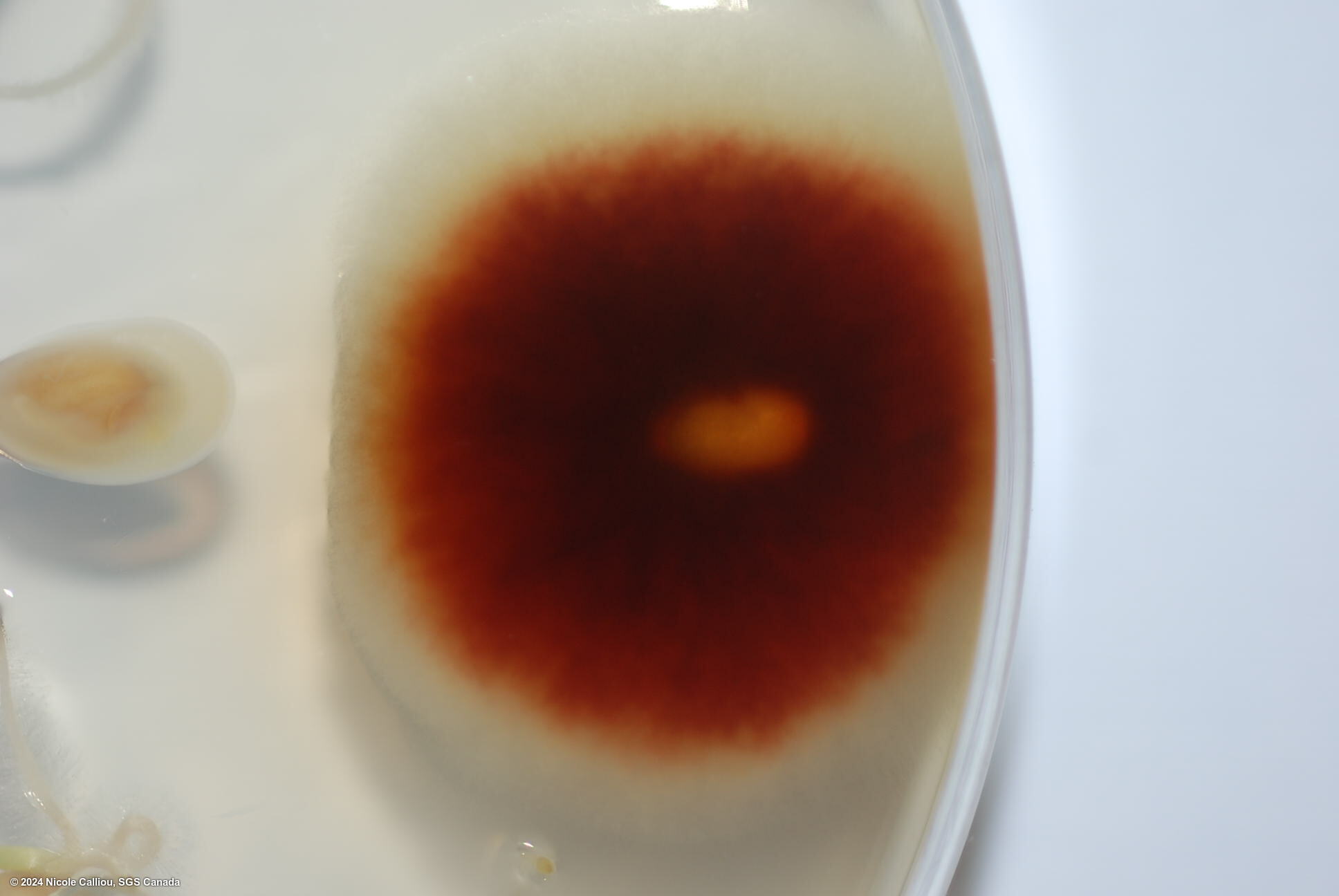 Colonies are usually white to red to green on top, and always red on rear. Yellowish stain produced in PDA agar around colony.