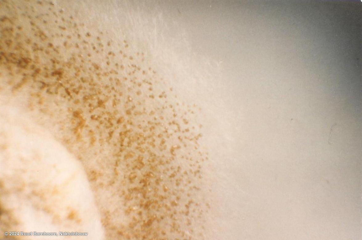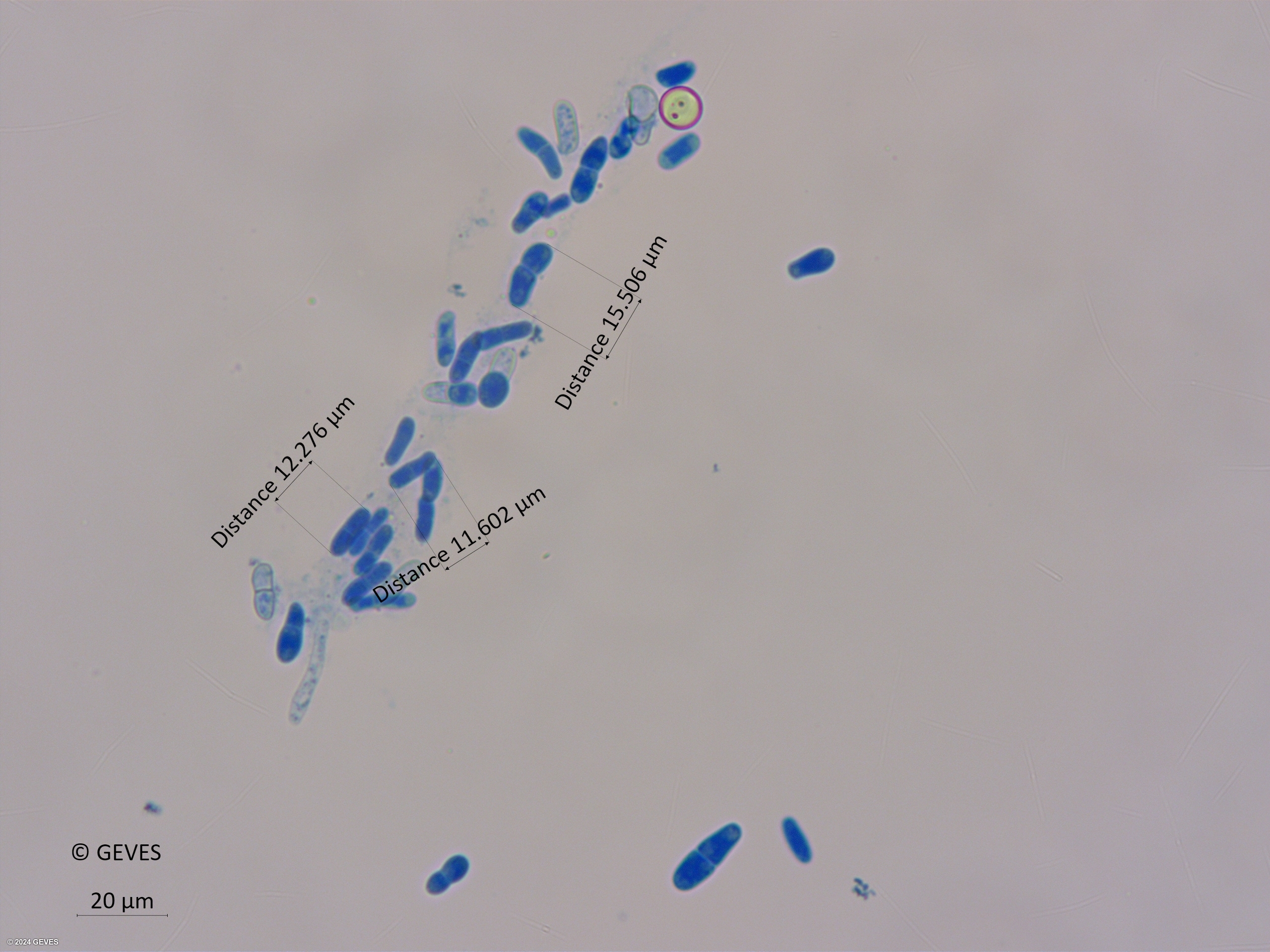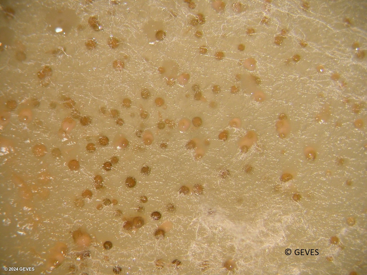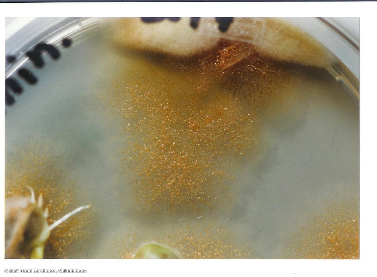 After 7 days of growth in an appropriate chamber, examine seeds for abundant white mycelium with often covers infected seeds. Confirm colonies by looking for presence of wavy hyphae at the edge of the colony when examined under x25 magnification. Colony diameter typically 20-30 mm, occasionally smaller or incompletely surrounding the seed. Reverse of colonies medium to dark orange-brown centrally, opaque and even, becoming lighter in colour towards the edge of the colony. Gelatinous-looking orange-brown pycnidia often present (although only sometimes clealry visible), particularly where seed touches agar. Under STM at x20-25 magnification, using both transmitted and incident light, hyphae are curled, over several running together, typically with moisture drops (although these evaporate easily). Very limited growths from some seeds may only be seed if dishes tilted to get lighting at best angle, or under STM examination or after extended incubation. Pycnidia are up to 250 um in diamter. Spores, hyaline, cylindric, or slightly curned with rounded ends, 1-septate, slightly constricted at septum, mostly 12 x 4.5 um (Punithalingam & Holliday, 1972).