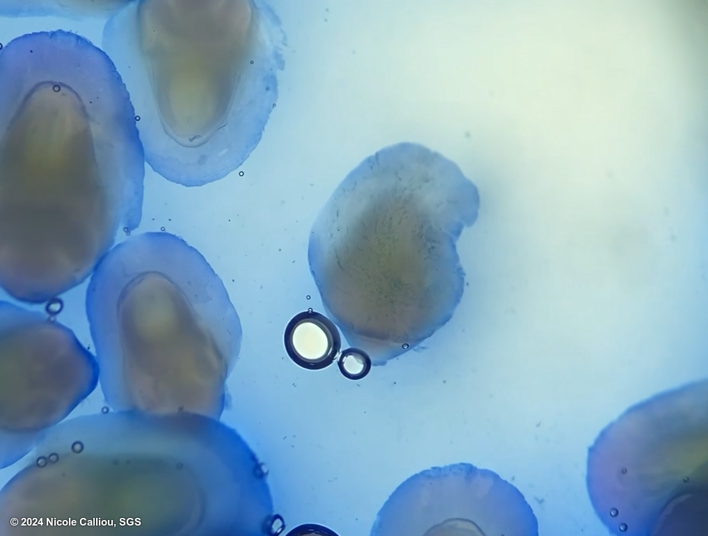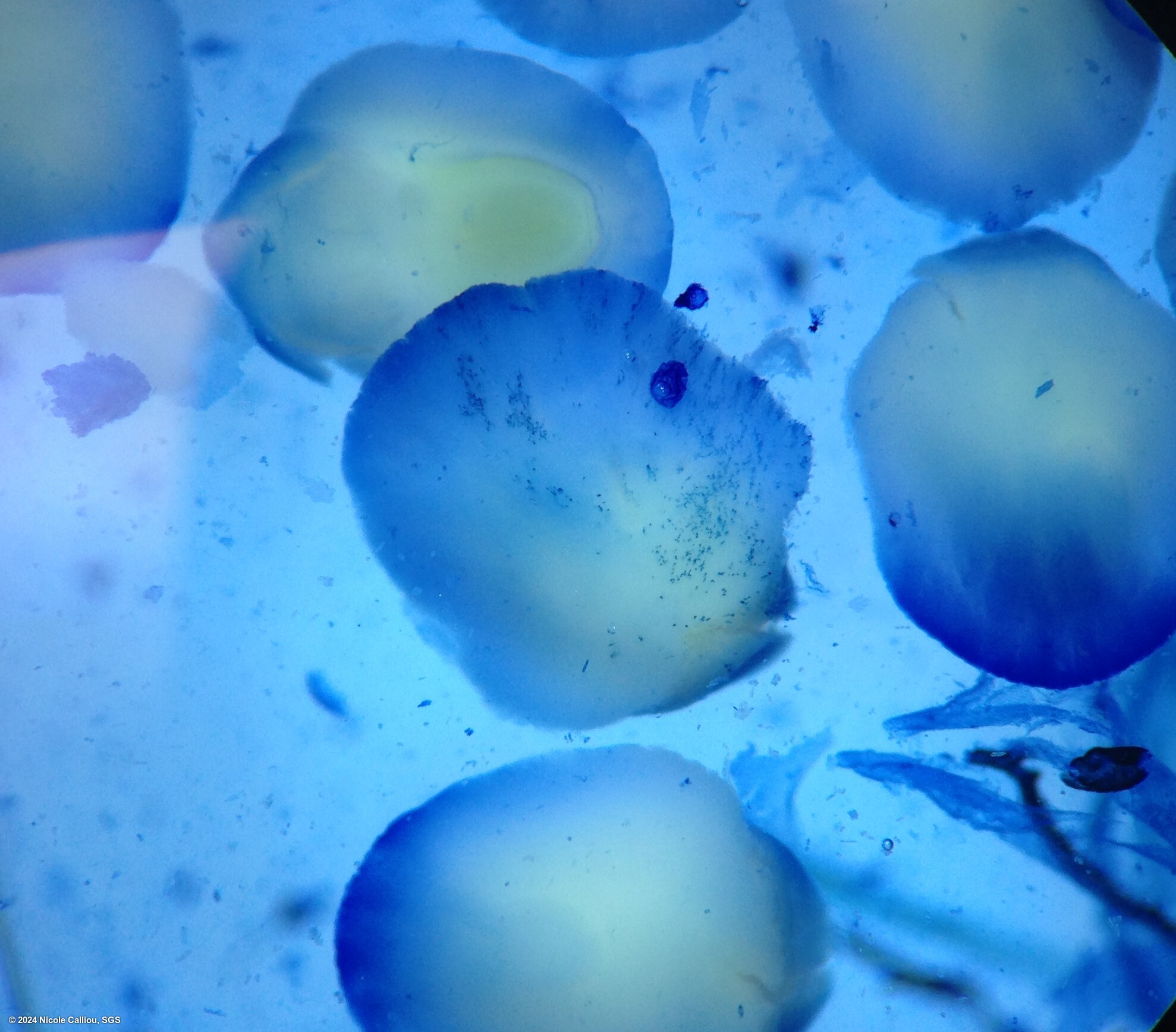 Mycelium is approximately 3um thick, golden brown in colour and visible without stain (although staining is an aide that can assist the pathologist). Infection may vary from a few strands of short hyphae to complete invasion of the scutellum tissues, often denser on one side.