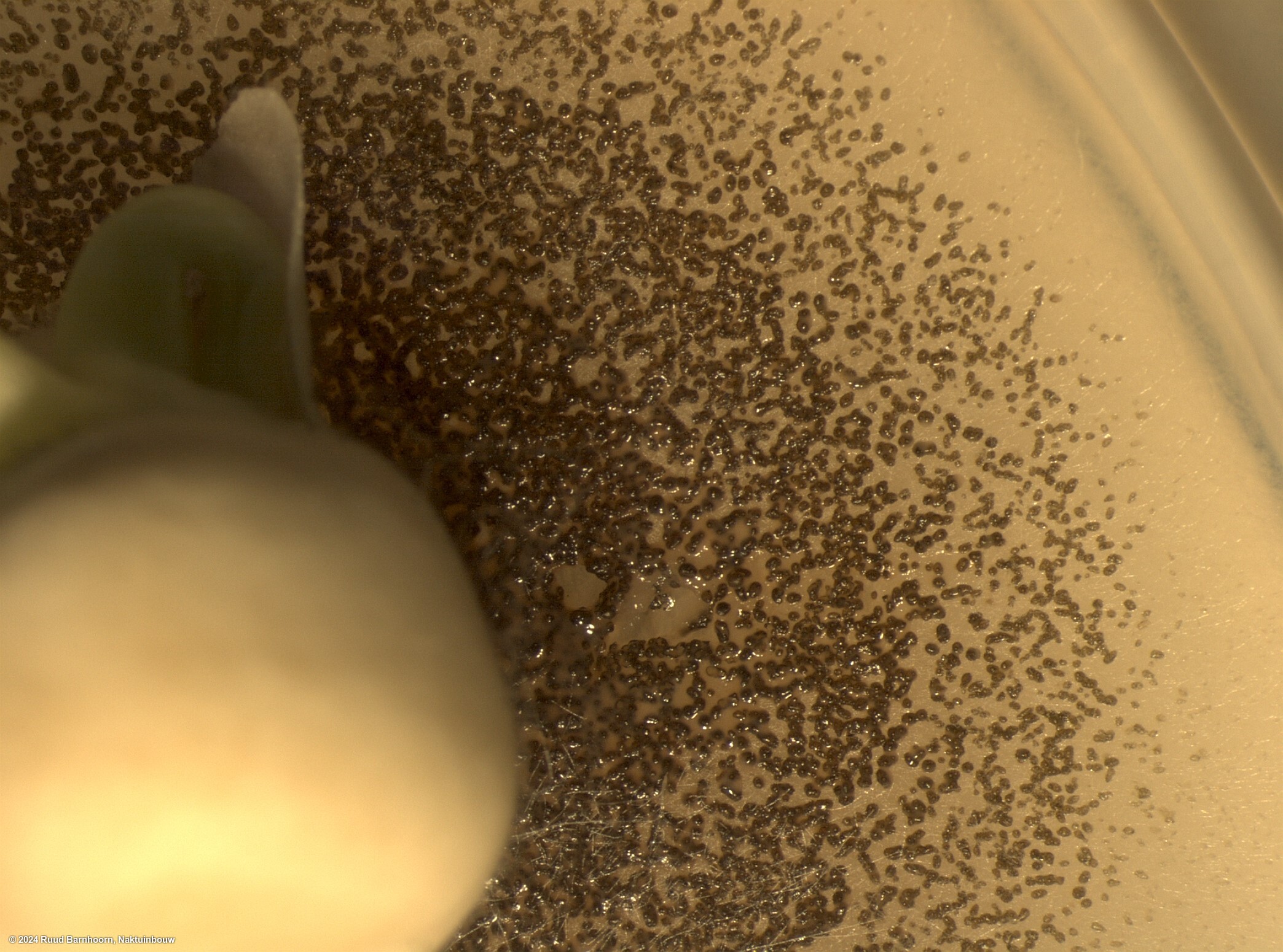 Pycnidia are globose and brown or black. Conidia (2-3 x 4.5-8 μm) are smaller than those of D. pinodes, hyaline, 1- or 2-septate and oval-cylindric with rounded edges. Profuse dark chlamydospores are both intercalary and terminal and are borne singly and in chains. Optimal temperatures for pycnidium and spore production on PDA are 18-24C. Light is required for conidial germination. Colonies are dark grey, and many become black at maturity. Some isolates appear slick because of the predominance or oozing pycnidia and chlamydospores over the mycelium. The principle characteristic differentiating the three Asochyta spp. is the presence of perithecia in D. pinodes. The conidia of D. pinodella are distinctly smaller and more spherical than those of A. pisi. The conidial dimensions of D. pinodes and D. pinodella overlap; however the absence of septa in a large portion of D. pinodella is also a distinguishing feature.