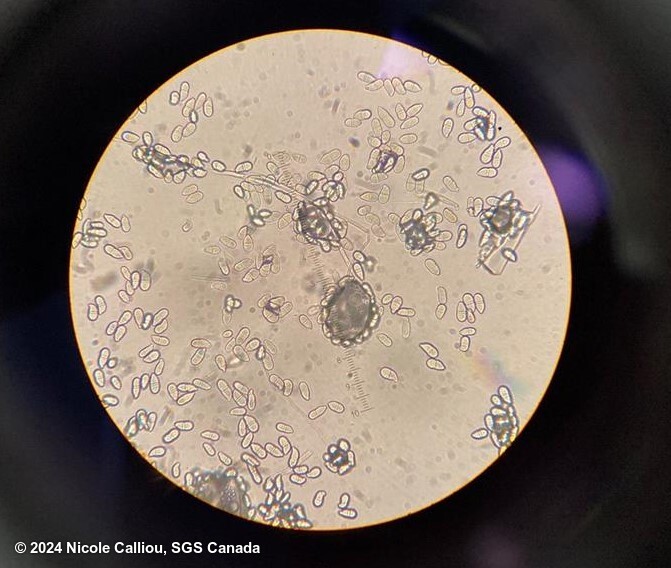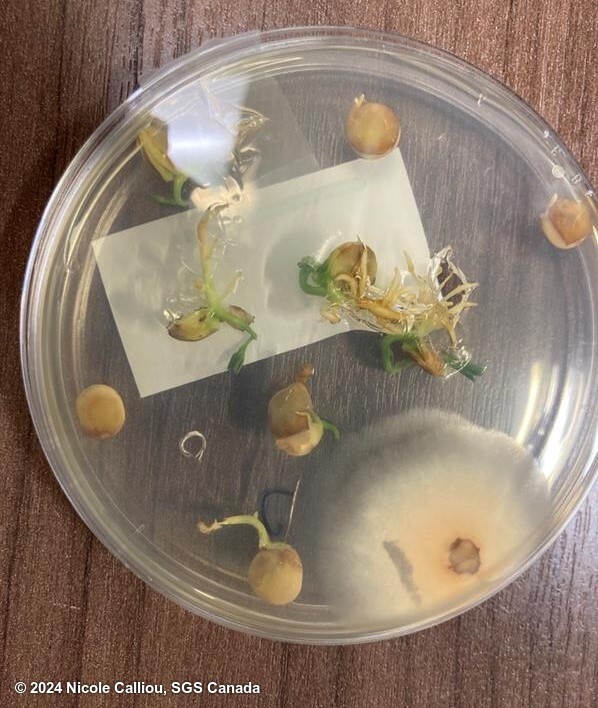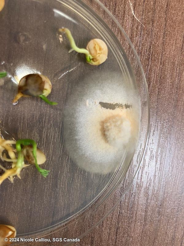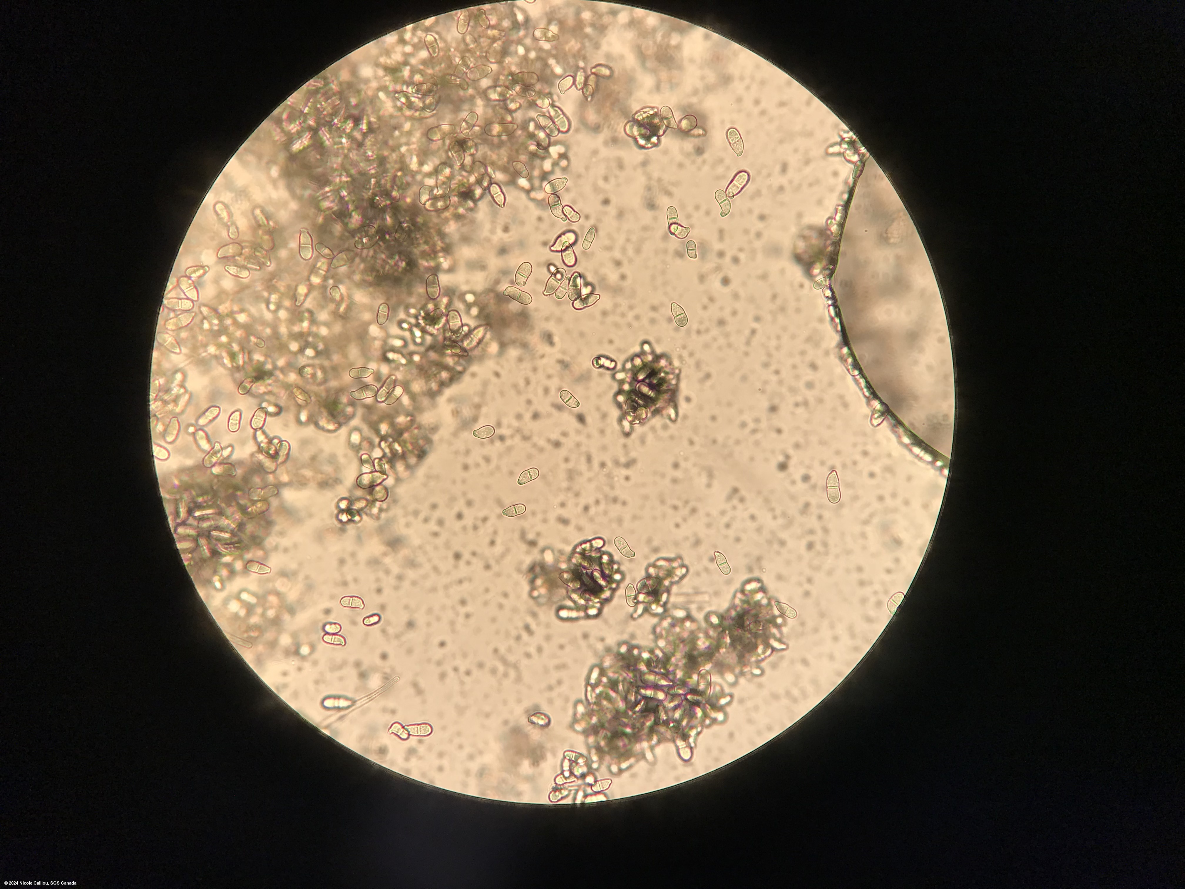 Pinkish colonies that are flat, granular and powdery in appearance. Conidia are typically 2-celled, with the apical cell being larger than the curved basal cell (posessing an obvious hilum).
